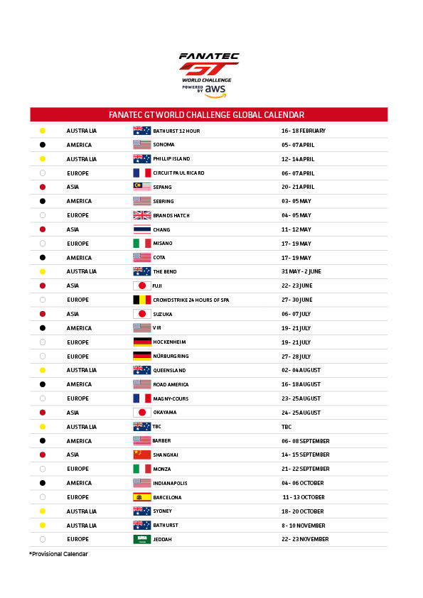 The 2024 season will commence with the Fanatec GT Australia contesting the Bathurst 12 Hour from 16-18 February. This globally recognised competition, established in 2019, draws from established continental series in Europe, Asia, America, and Australia. Each series runs independently while contributing towards the Fanatec GT World Challenge Powered by AWS manufacturers' standings.